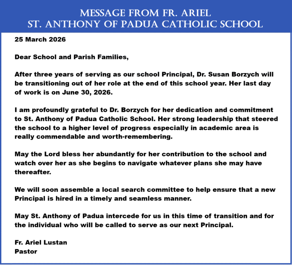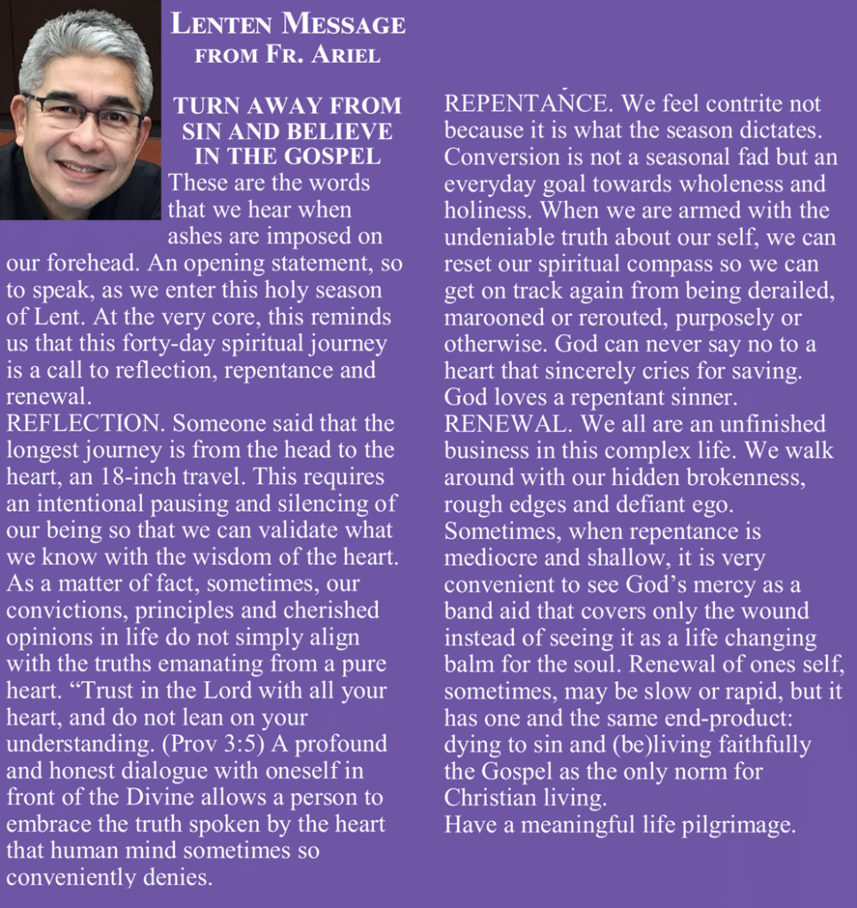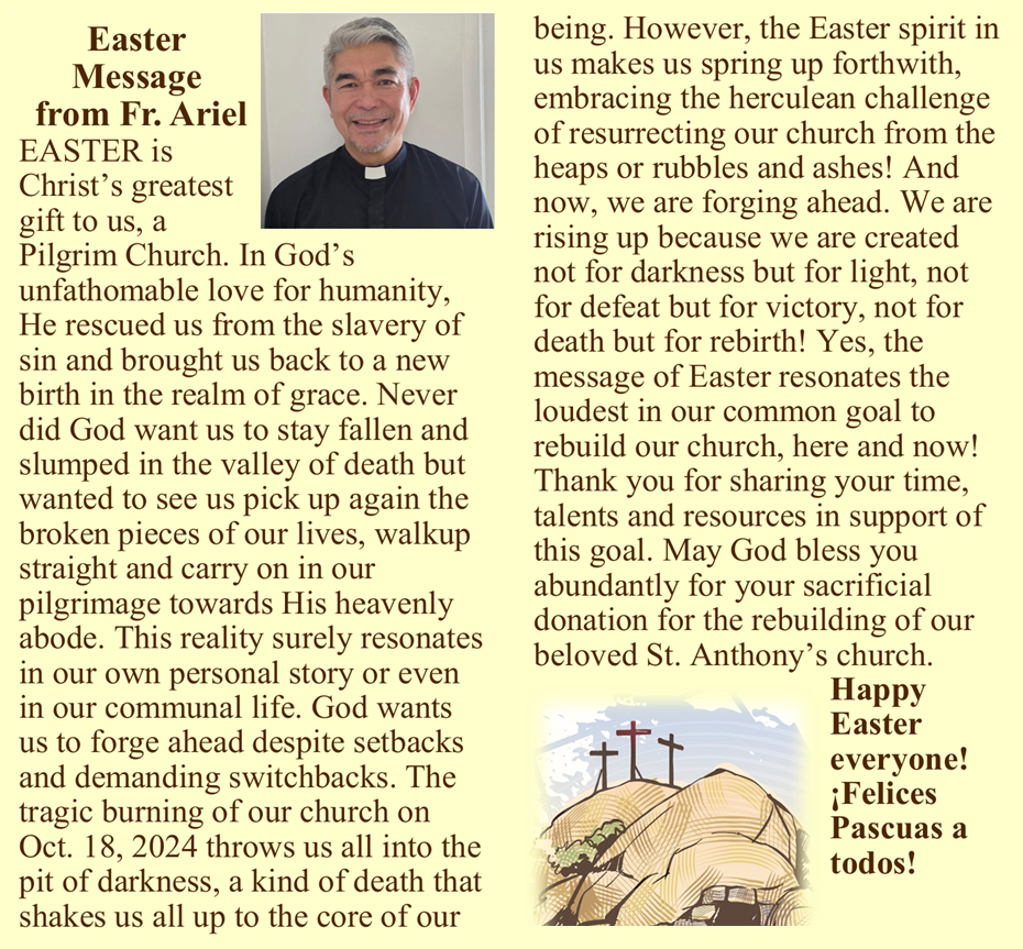 “Baptized in the Body of Christ, bound by faith and love, and strengthened by Word and Sacrament, we are called to center our lives upon our celebrations of the Eucharist and the living of our Christian faith within the Catholic tradition. As a parish community, we will be united and extend our love, strength and purpose to all people through evangelization, teaching and prayer.”