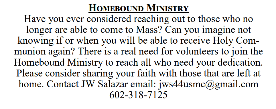 Thank you for your continued support in feeding the homeless of Casa Grande. Wednesdays, our volunteers provide hot meals for 35-40 homeless brothers/sisters in Christ within our community. Donations may be made out to the St. Anthony’s Crock Pot Ministry and dropped off in the collection during Mass.