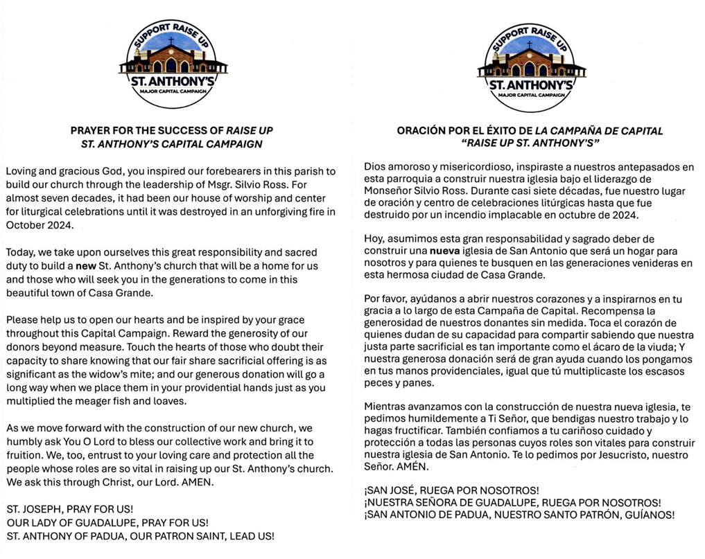 Oración Por El Éxito De La Campaña De Capital “Raise Up St. Anthony’s”.