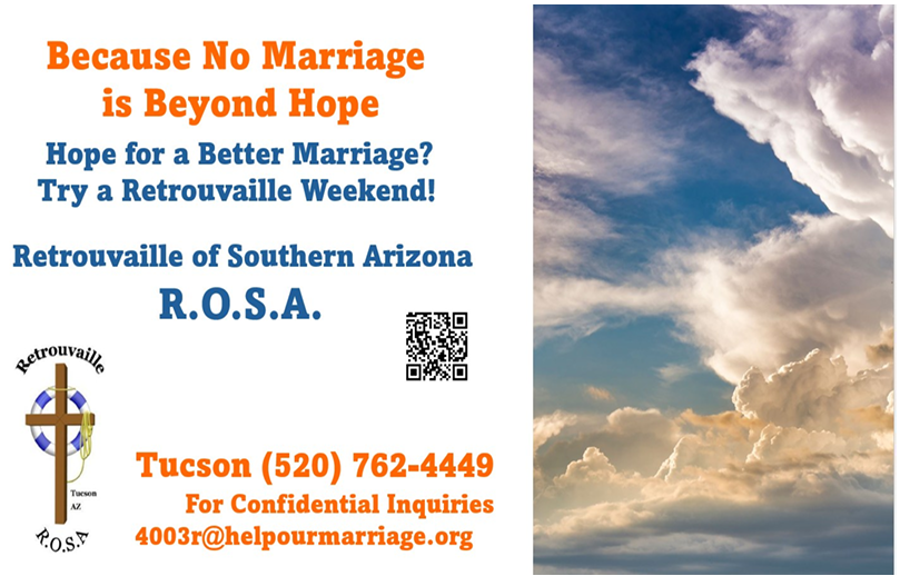 Marriage Help – A Retrouvaille Weekend can help couples rediscover peace, hope, and purpose in their marriage. Visit: www.retrouvaille.org, Call or Text (520) 762-4449. Retrouvaille es un programa para parejas casadas que se sienten aburridas, frustradas o enojadas en su matrimonio. Retrouvaille ayuda a las parejas a través de las oportunidades ofrecidas para escuchar, perdonar, reconciliarse y avanzar hacia su