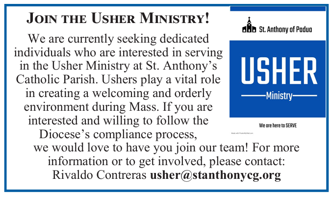 Primary duties and responsibilities include: creating a welcoming and orderly environment during Mass.